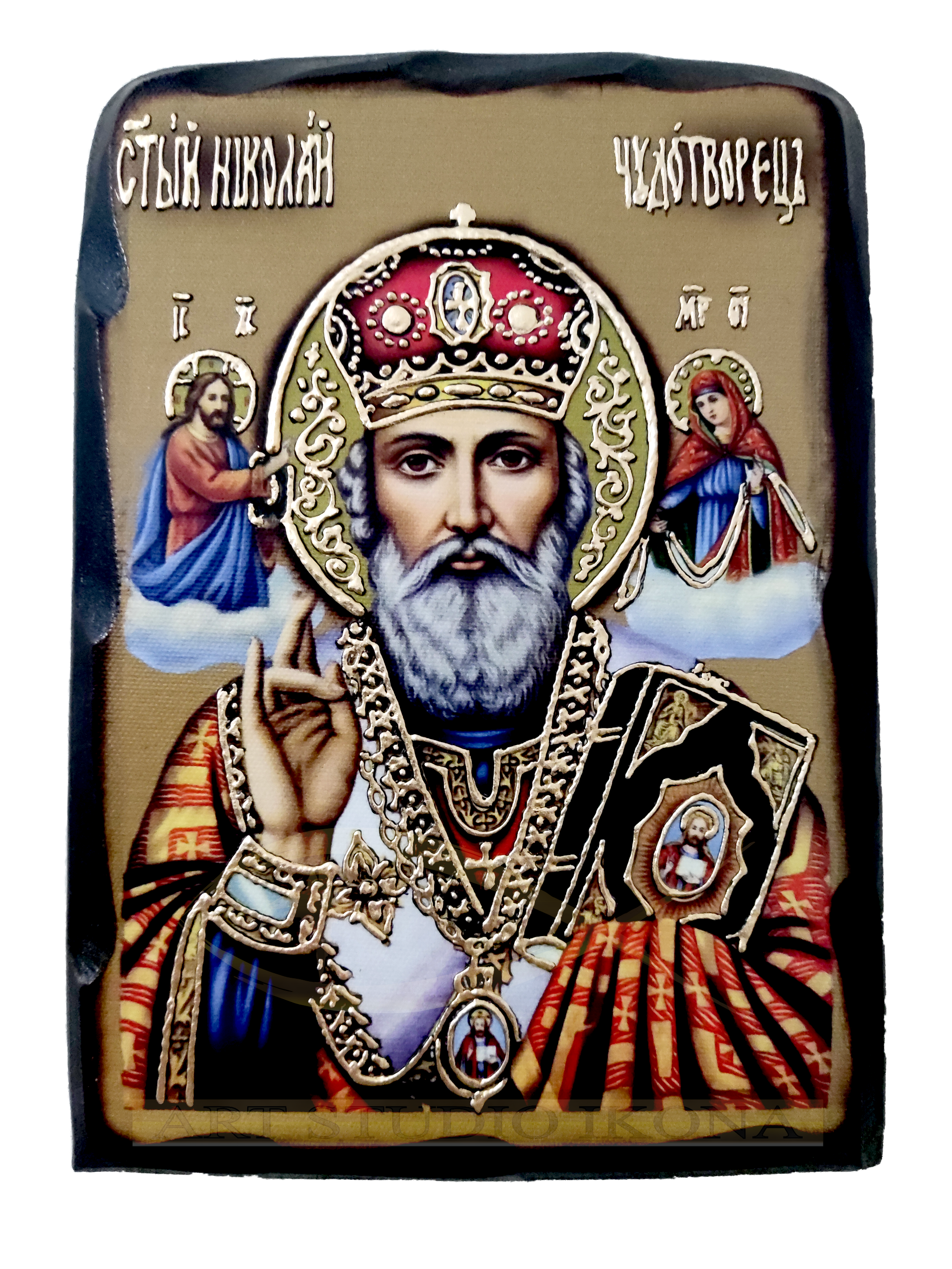 Рачно изработени икони на уметничко платно со пигментни бои, премачкани со UV лак за висока издржливост и заштита од надворешни влијанија, нанесени на дрво, оцртани и украсени со златни релјефни орнаменти изработени од искусен мајстор сликар. Автентични и ексклузивни византиски теми. VIP (Premium Luxury Unique)
