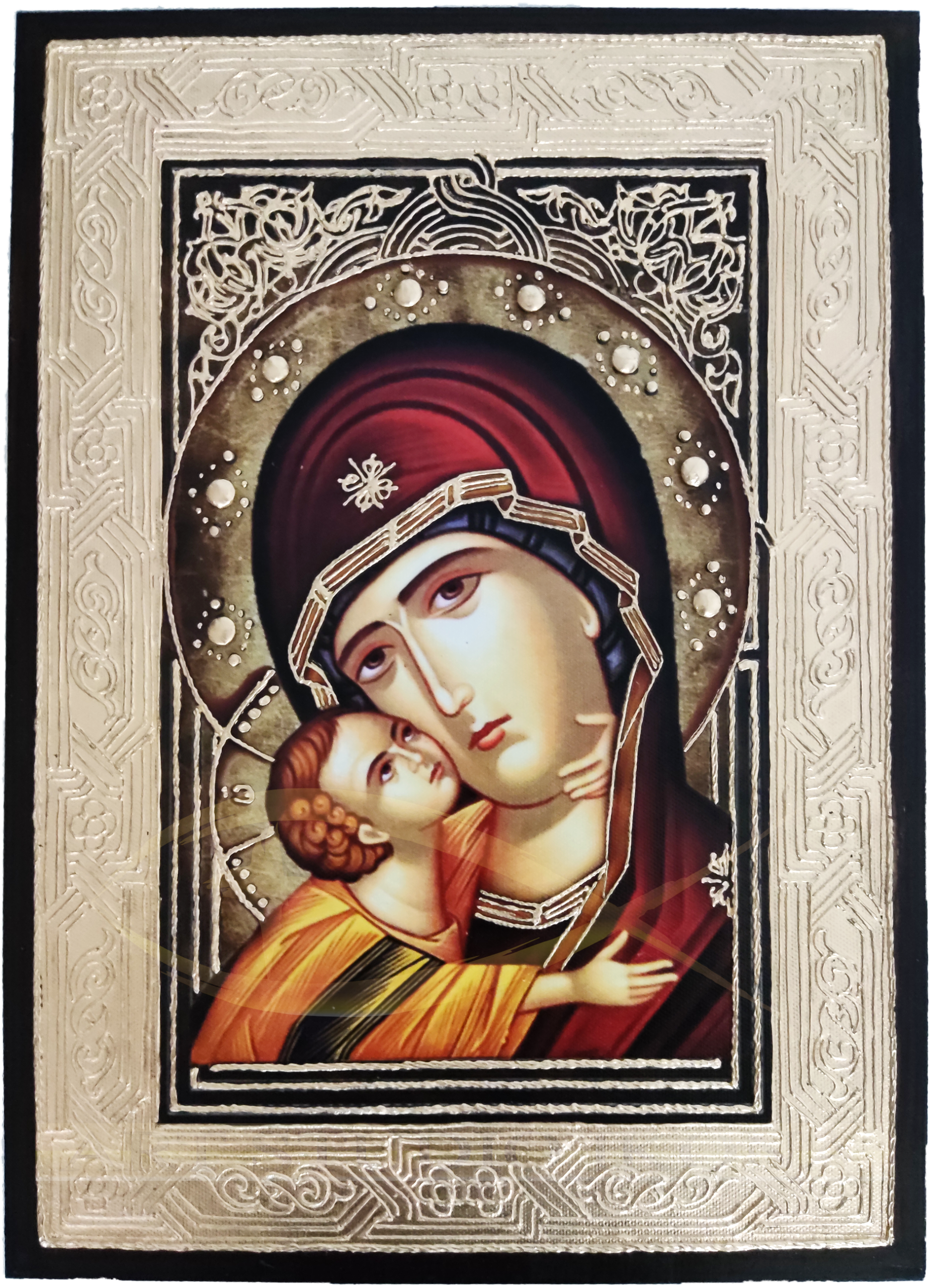 Handcrafted icon on artistic canvas using pigment-based paints, coated with UV varnish for high durability and protection against external influences. Mounted on wood, outlined and decorated with gold embossed ornaments, crafted by an experienced master painter.